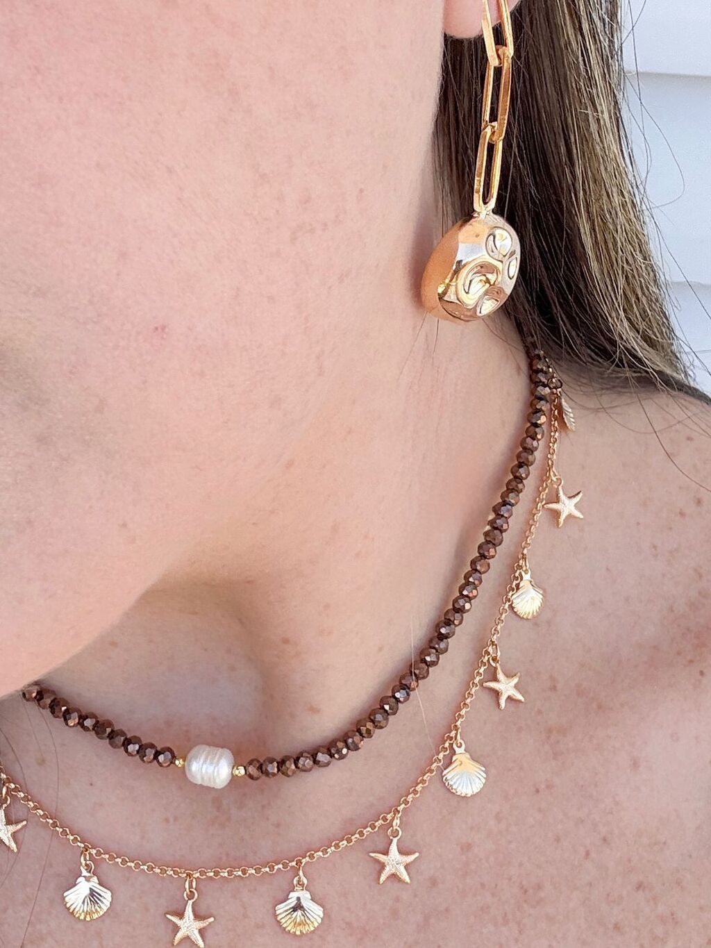 Brinco de Pino Longo Elos com Botão Banhado a Ouro 18k