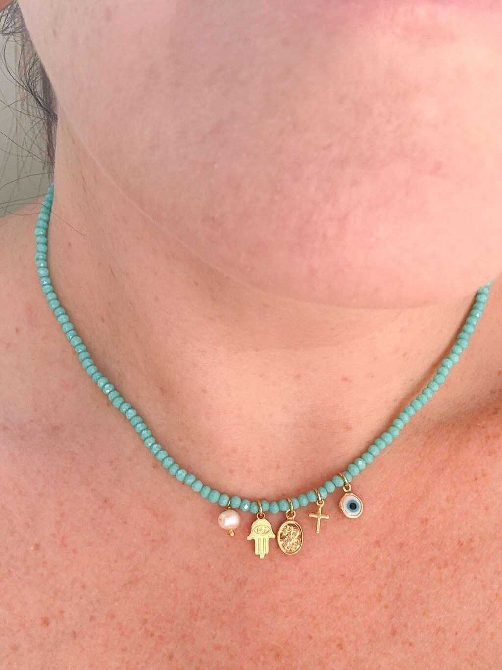Colar Choker Cristais Turquesa com Pingentes Banhado a Ouro 18k