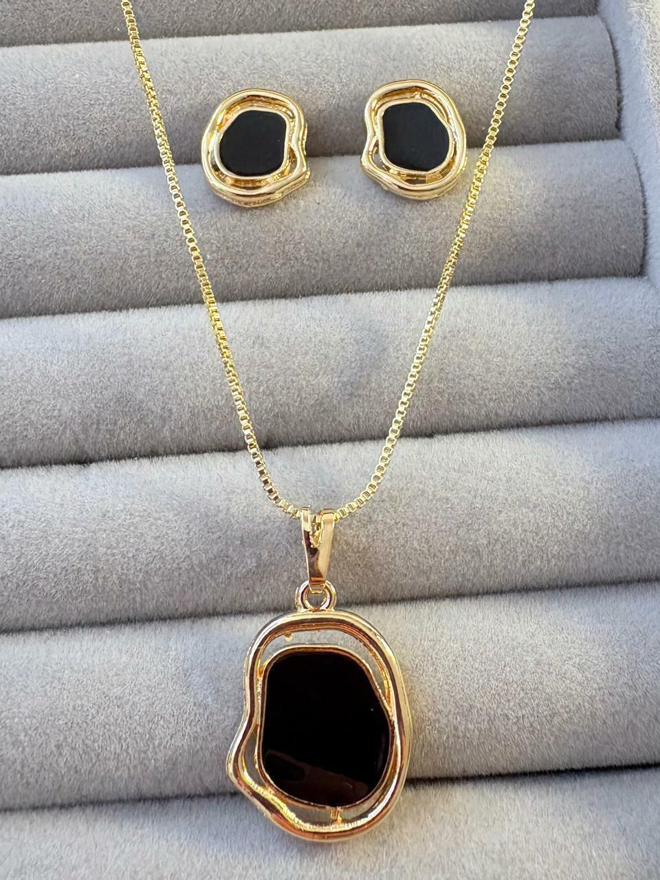 Material: Banhado a ouro 18k com verniz protetor e acabamento de alta qualidade. Pingente e brinco com resinado na cor preta